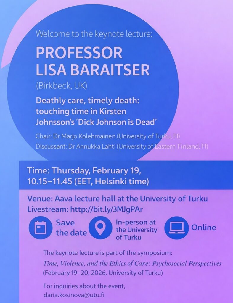 The keynote lecture is part of the symposium:  Time, Violence, and the Ethics of Care: Psychosocial Perspectives (February 19-20, 2026, University of Turku)